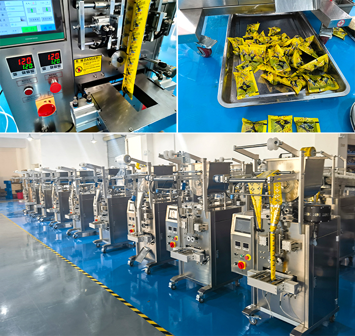 工作人員提前將所需包裝的物料放置在料箱內,并在顯示屏幕進行設定包裝規(guī)格以及參數(shù),啟動立式醬料包裝機后,物料開始在料箱內進行均勻的攪拌動作,并結合輸送系統(tǒng)快速穩(wěn)定的輸送至充填處。與此同時,小型火鍋底料包裝機械的制袋系統(tǒng)會在同一時間將卷膜快速制成包裝袋,確保物料與醬料共同輸出,在經過充填時,稱重系統(tǒng)會按照設定的包裝參數(shù)進行標準的輸出,在達到預設重量后,將準確充填進包裝袋內,此時的封口裝置將通過加熱、加壓的方式,使其封口部位熱熔并粘合在一起,實現(xiàn)密封包裝成果。