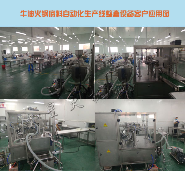 6、牛油火鍋底料自動化生產線整套設備智能灌裝系統:全自動灌裝機對物料進行雙料、單料灌裝;